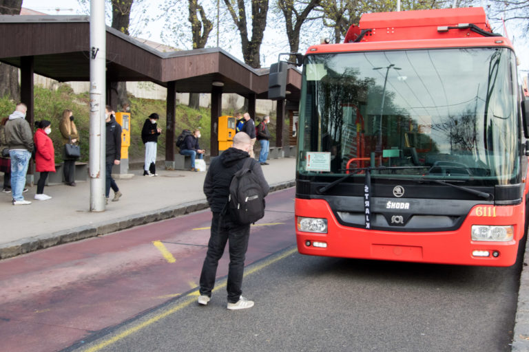Cestujúci na bratislavskej Hlavnej stanici počas výstražného štrajku vodičov Mestskej hromadnej dopravy (MHD), ktorý ohlásili odborové organizácie Dopravný podnik mesta Košice a Dopravný podnik Bratislava s cieľom upozorniť štátne orgány na poskytnutie finančnej pomoci od štátu prevádzkovateľom MHD v dôsledku výpadkov príjmov vyvolanom pandémiou Covid-19. Bratislava, 12. apríl 2021. Foto: SITA/Ľudovít Vaniher