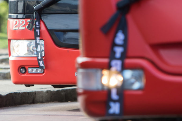 Odstavené autobusy na bratislavskej Hlavnej stanici počas výstražného štrajku vodičov Mestskej hromadnej dopravy (MHD), ktorý ohlásili odborové organizácie Dopravný podnik mesta Košice a Dopravný podnik Bratislava s cieľom upozorniť štátne orgány na poskytnutie finančnej pomoci od štátu prevádzkovateľom MHD v dôsledku výpadkov príjmov vyvolanom pandémiou Covid-19. Bratislava, 12. apríl 2021. Foto: SITA/Ľudovít Vaniher