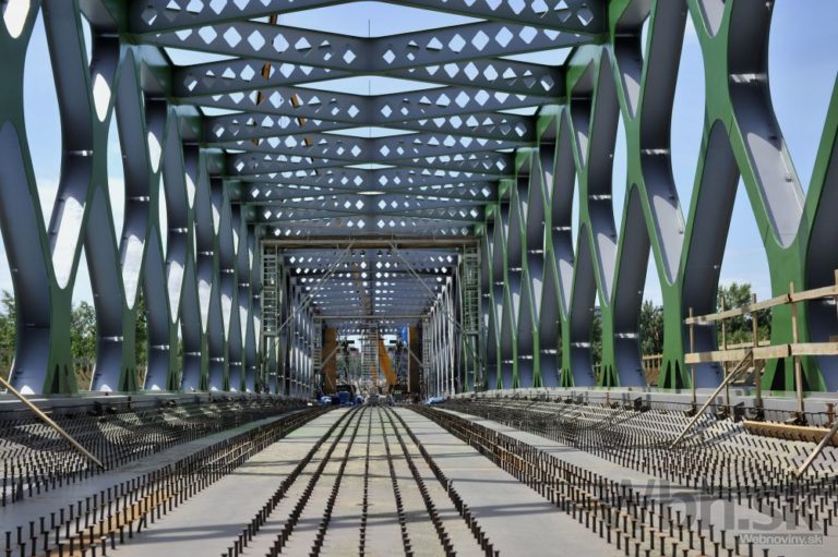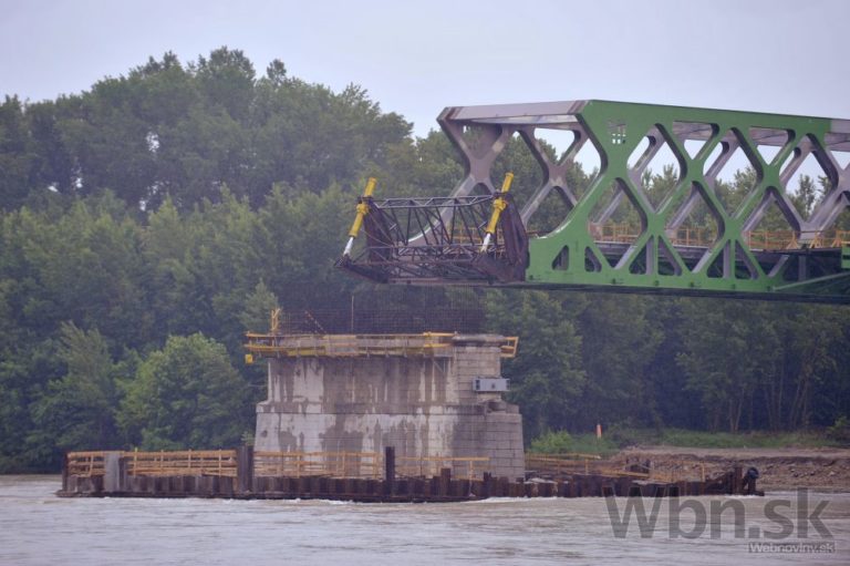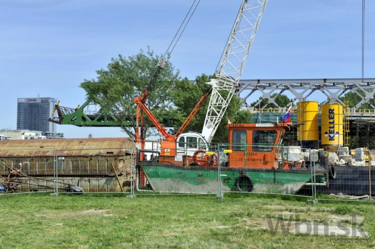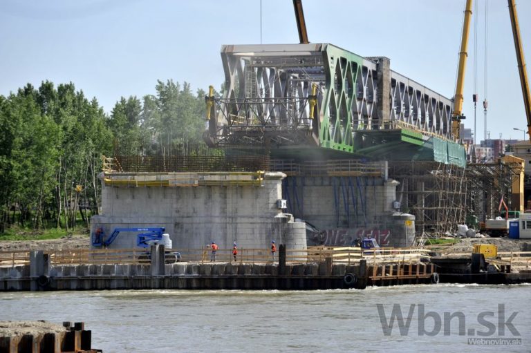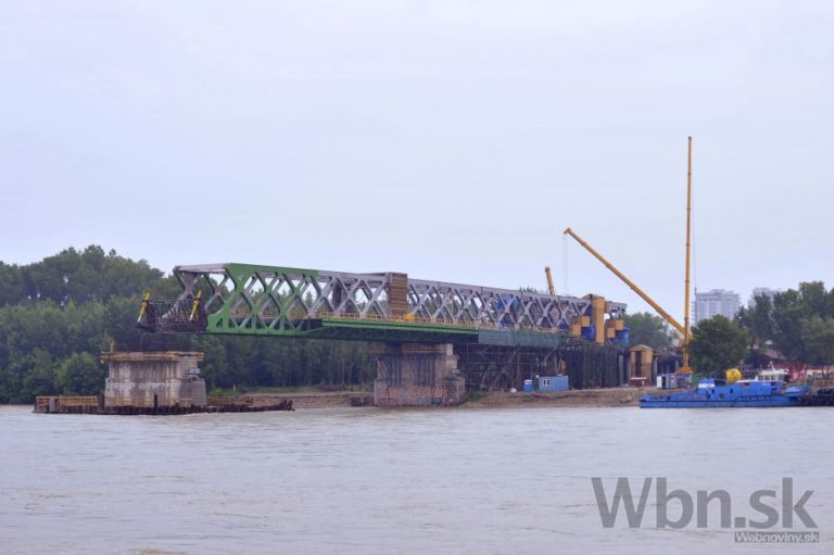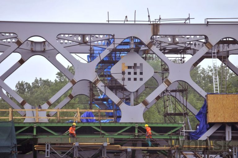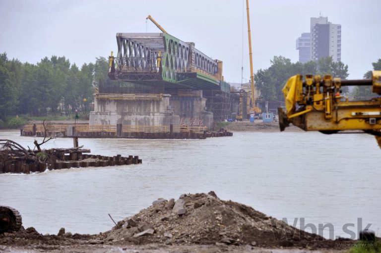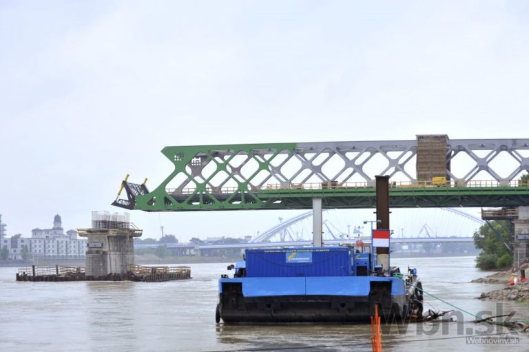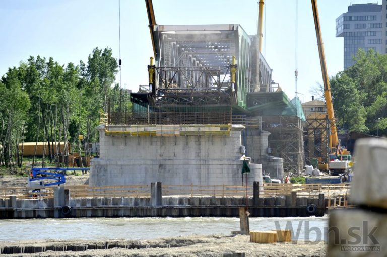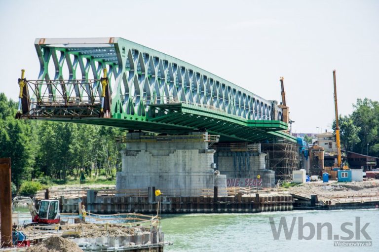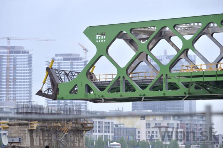 Pohľad na Starý most počas vysúvania konštrukcie o ďalších 30 metrov. Okrem toho Starý most dostáva postupne aj zeleno-sivý náter. O takomto farebnom prevedení rozhodli obyvatelia mesta v ankete. Za zeleno-sivý variant mosta hlasovalo takmer 2 500 ľudí z vyše šesťtisíc obyvateľov, ktorí sa do ankety zapojili. Bratislava, 26. máj 2015. Foto: SITA/Ján Slovák