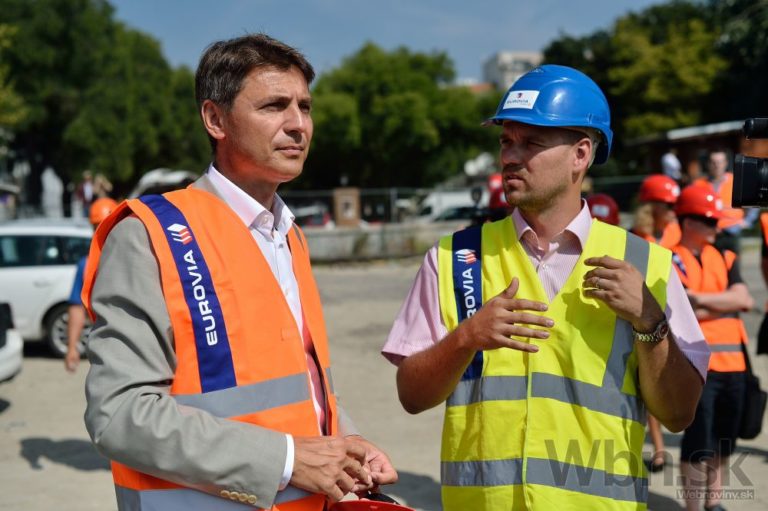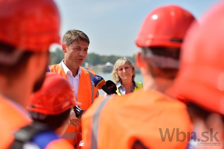Zľava: Primátor Bratislavy Ivo Nesrovnal a riaditeľ stavby Peter Tekeľ zo spoločnosti Eurovia SK počas brífingu pri príležitosti prípravy na výsuv konštrukcie na Starom moste. Bratislava 28. august. Foto: SITA/Robert Tappert