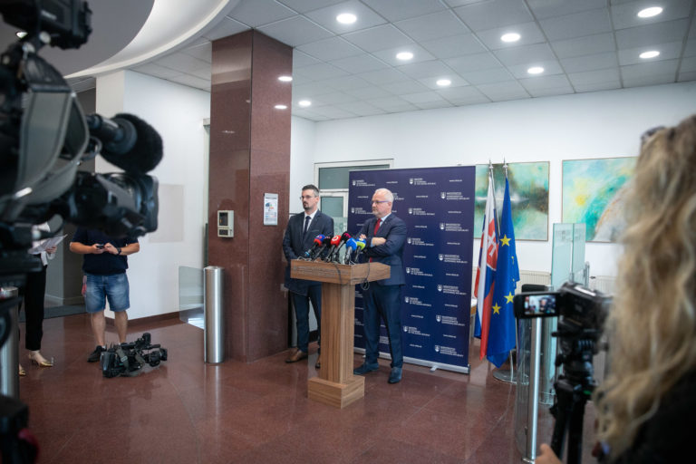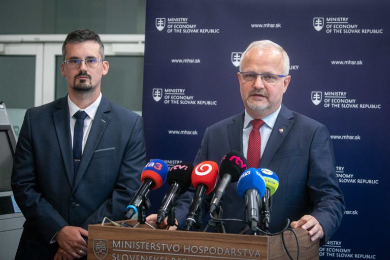 Sprava: Štátny tajomník ministerstva hospodárstva SR Peter Švec a vedúci oddelenia udržateľnej mobility ministerstva hospodárstva SR Adrián Krajňák počas brífingu Ministerstva hospodárstva SR na tému: Vyhlásenie výzvy s názvom "Výzva na podporu budovania nabíjacej infraštruktúry pre elektrické vozidlá pre právnické osoby a fyzické osoby podnikateľov". Bratislava, 28. august 2023. Foto: SITA/Diana Černaková