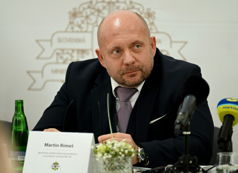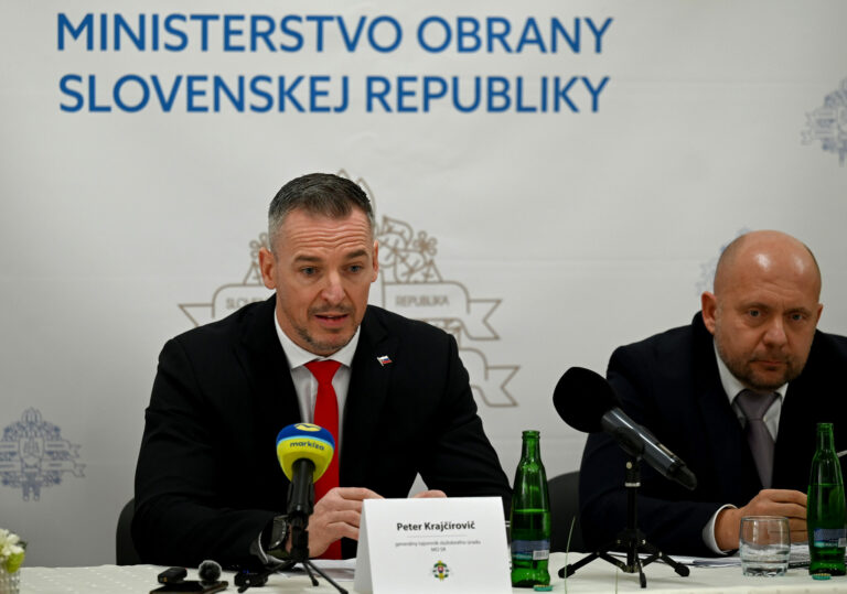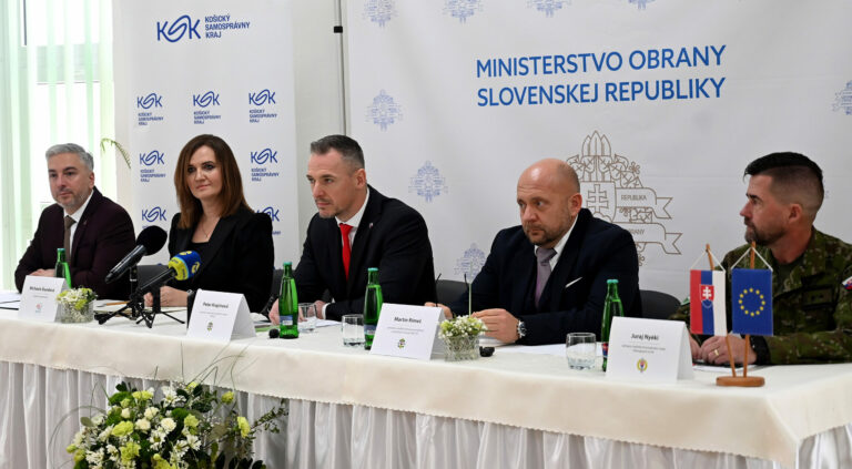 Zľava: Generálny tajomník služobného úradu Ministerstva obrany SR Peter Krajčírovič, generálny riaditeľ sekcie personálnych a sociálnych činností MO SR Martin Rímeš počas tlačovej konferencie Ministerstva obrany (MO) Slovenskej republiky a Košického samosprávneho kraja (KSK) na tému: Vznik prvej vojenskej triedy na strednej škole v Sečovciach. Sečovce,15. január 2025. Foto: SITA/Viktor Zamborský