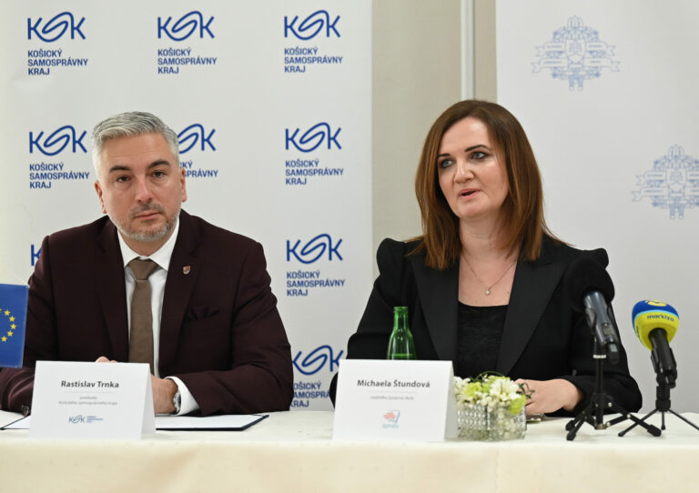 Zľava: Predseda Košického samosprávneho kraja (KSK) Rastislav Trnka a riaditeľka Spojenej školy Michaela Štundová počas tlačovej konferencie Ministerstva obrany Slovenskej republiky a Košického samosprávneho kraja na tému: Vznik prvej vojenskej triedy na strednej škole v Sečovciach. Sečovce,15. január 2025. Foto: SITA/Viktor Zamborský