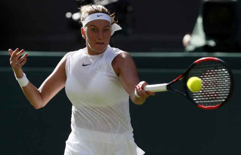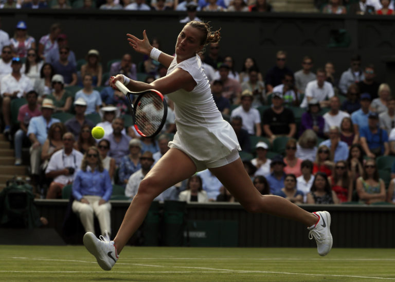 Czech Republic's Petra Kvitova returns to Sweden's Johanna Larsson during their Women's Singles Match on the opening day at the Wimbledon Tennis Championships in London Monday, July 3, 2017. (AP Photo/Kirsty Wigglesworth)