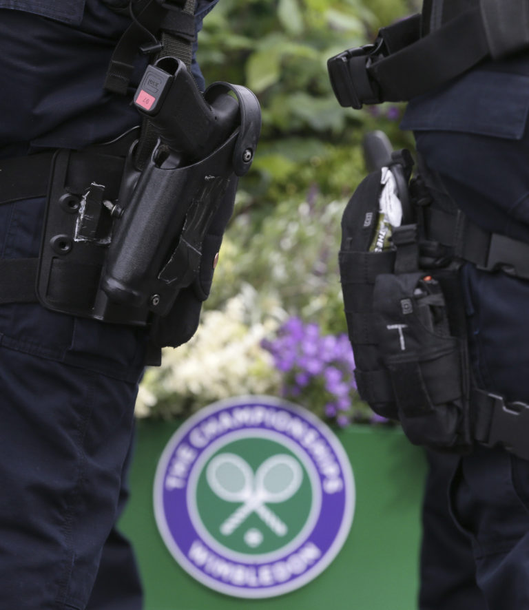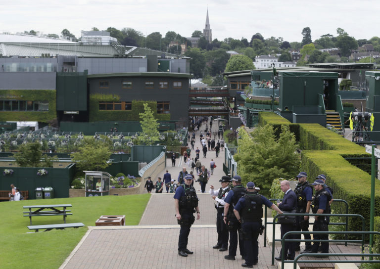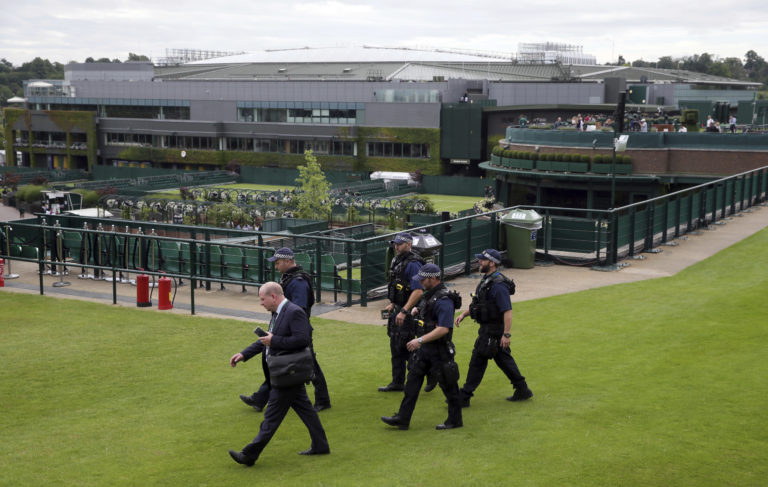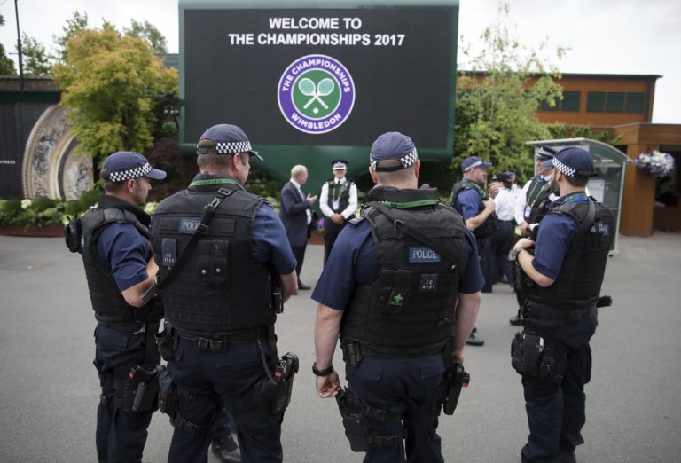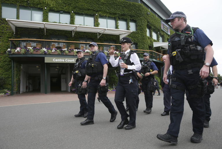 Hliadkujúci policajti počas úvodného hracieho dňa Wimbledonu. Londýn, 3. júl 2017. Foto: SITA/AP.