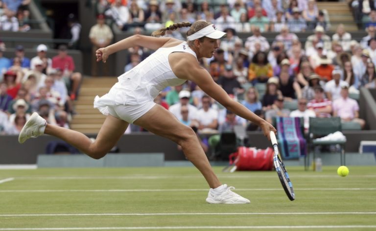 Belgičanka Elise Mertensová počas zápasu 1. kola Wimbledonu, v ktorom podľahla Američanke Venus Williamsovej 6:7, 4:6. Londýn, 3. júl 2017. Foto: SITA/AP