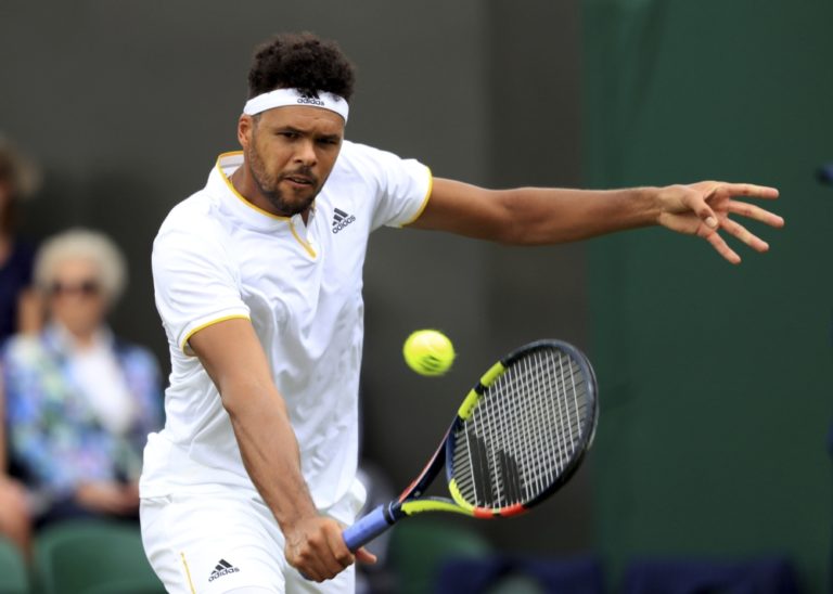 Francúz Jo-Wilfried Tsonga počas zápasu 1. kola Wimbledonu, v ktorom zdolal Brita Camerona Norrieho 6:3, 6:2, 6:2. Londýn, 3. júl 2017. Foto: SITA/AP