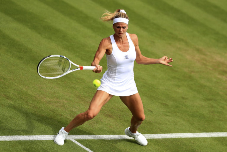Talianska tenistka Camila Giorgiová počas zápasu 1. kola Wimbledonu proti Francúzke Alizé Cornetovej. Londýn, 3. júl 2017. Foto: Adam Davy/PA via AP.
