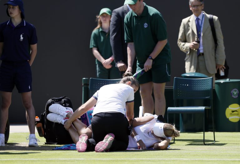 Ošetrovaná ruská tenistka Jelena Vesninová počas zápasu 2. kola Wimbledonu, v ktorom podľahla Bieloruske Viktorii Azarenkovej dvakrát 3:6. Londýn, 5. júla 2017. Foto: SITA/AP.