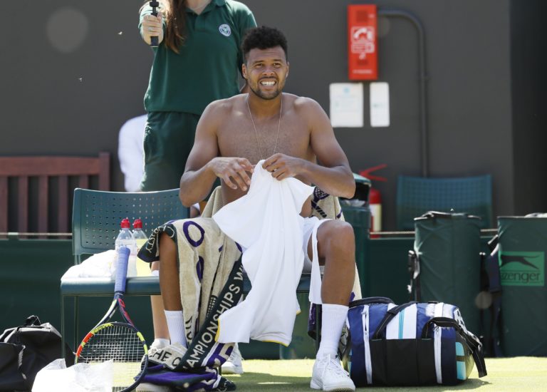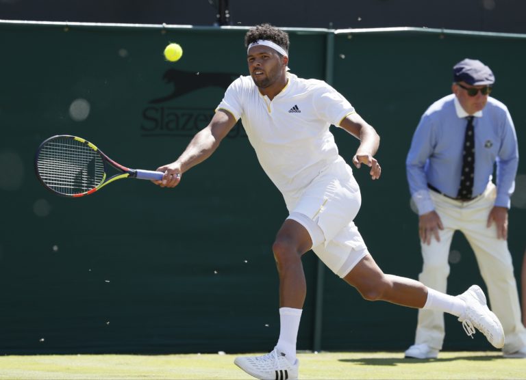Francúzsky tenista Jo-Wilfried Tsonga počas zápasu 2. kola Wimbledonu, v ktorom zdolal Taliana Simone Bolleliho 6:1, 7:5, 6:2. Londýn, 5. júla 2017. Foto: SITA/AP.