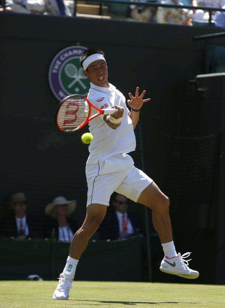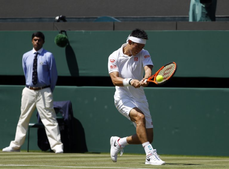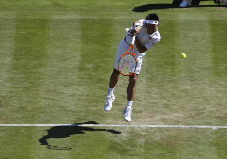 Japonský tenista Kei Nišikori počas zápasu 2. kola Wimbledonu, v ktorom zdolal Ukrajinca Sergija Stachovského 6:4, 6:7 (7), 6:1, 7:6 (6). Londýn, 5. júla 2017. Foto: SITA/AP.