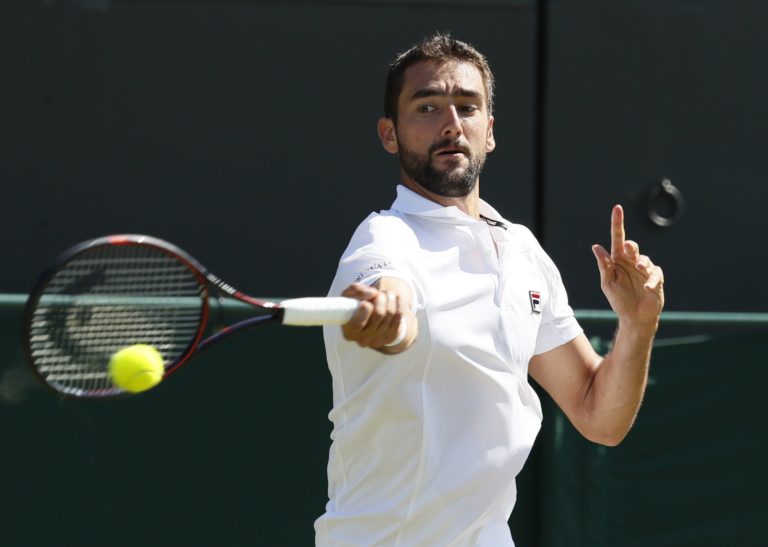 Chorvátsky tenista Marin Čilič počas zápasu 2. kola Wimbledonu, v ktorom zdolal Nemca Floriana Mayera 7:6 (2), 6:4, 7:5. Londýn, 5. júl 2017. Foto: SITA/AP.