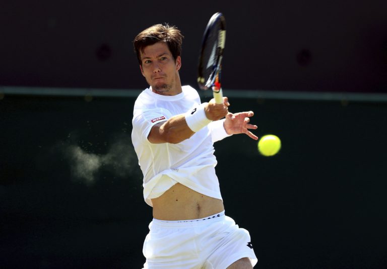 Britský tenista Aljaž Bedene počas zápasu 3. kola Wimbledonu, v ktorom podľahol Luxemburčanovi Gillesovi Mullerovi 6:7 (4), 5:7, 4:6. Londýn, 7. júl 2017. Foto: Adam Davy/PA via AP.