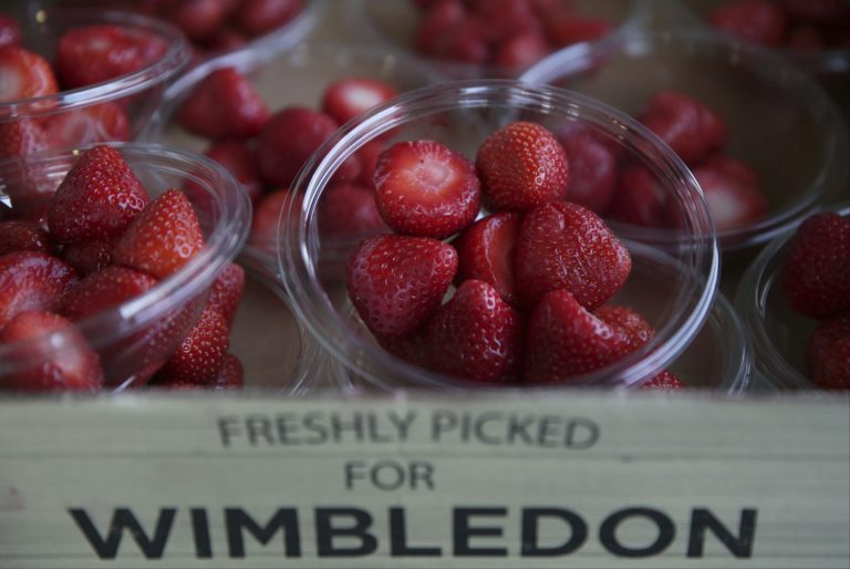 Tradičnou pochúťkou na Wimbledonu sú jahody so šľahačkou. Londýn, 7. júla 2017.