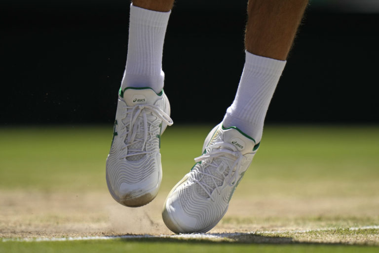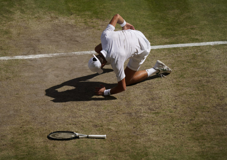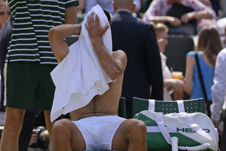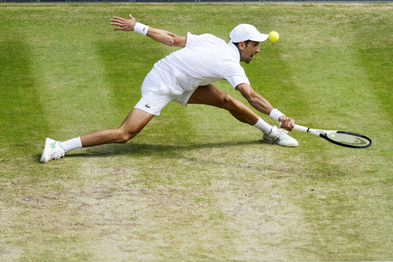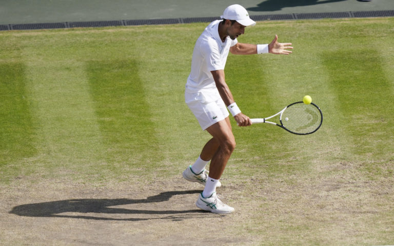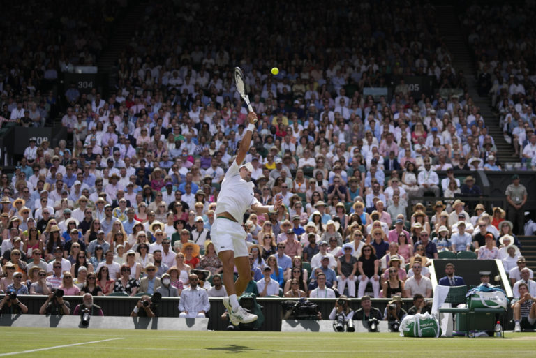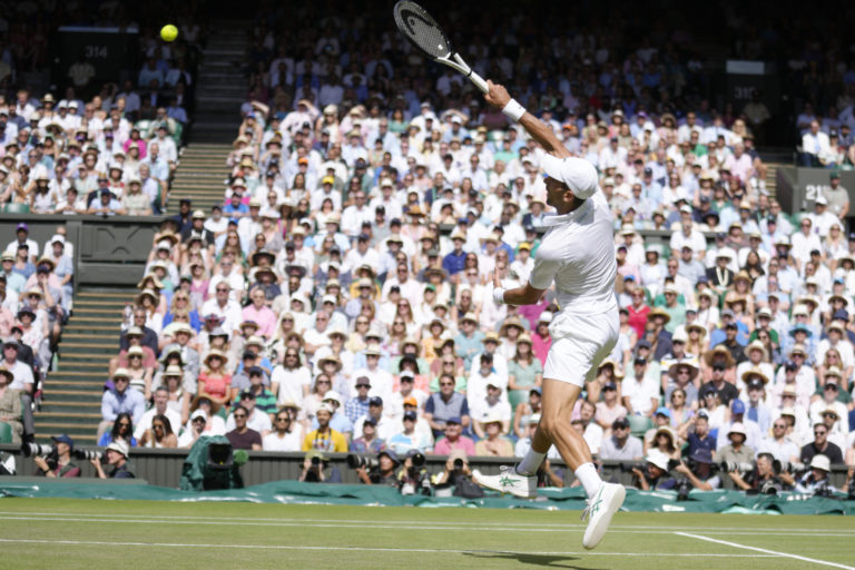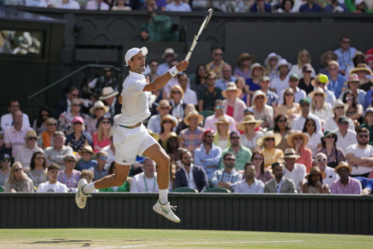 Srbský tenista Novak Djokovič počas finálového zápasu na Wimbledone 2022 proti Austrálčanovi Nickovi Kyrgiosovi. Londýn, 10. júl 2022. Foto: SITA/AP