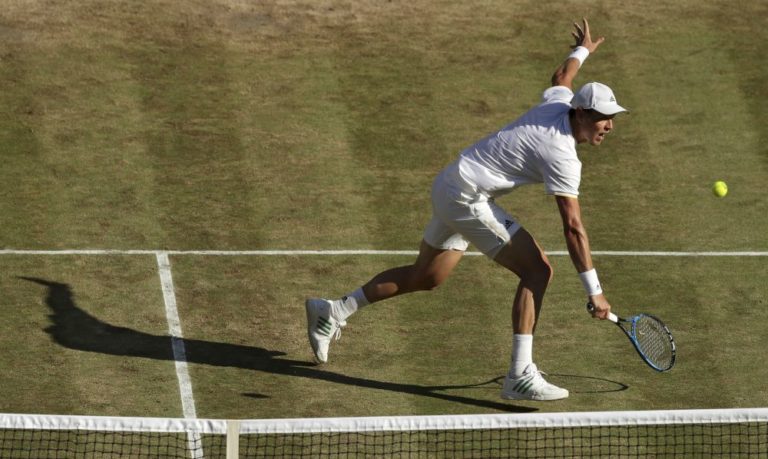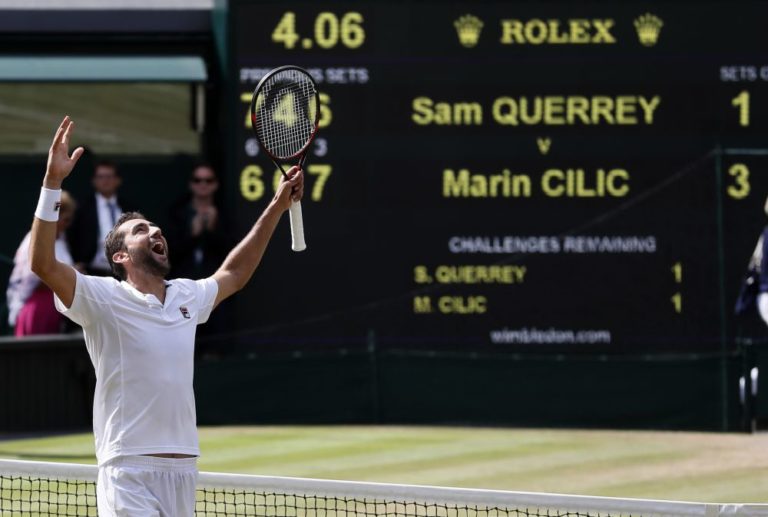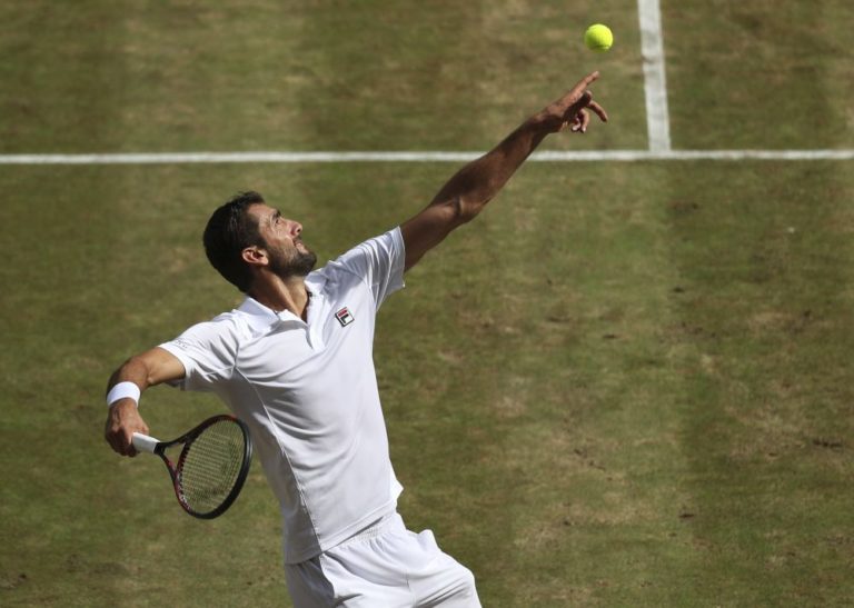 Chorvátsky tenista Marin Čilič počas zápasu semifinále Wimbledonu, v ktorom zdolal Američana Sama Querreyho 6:7, 6:4, 7:6, 7:5. Foto: SITA/AP