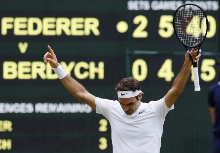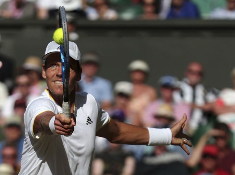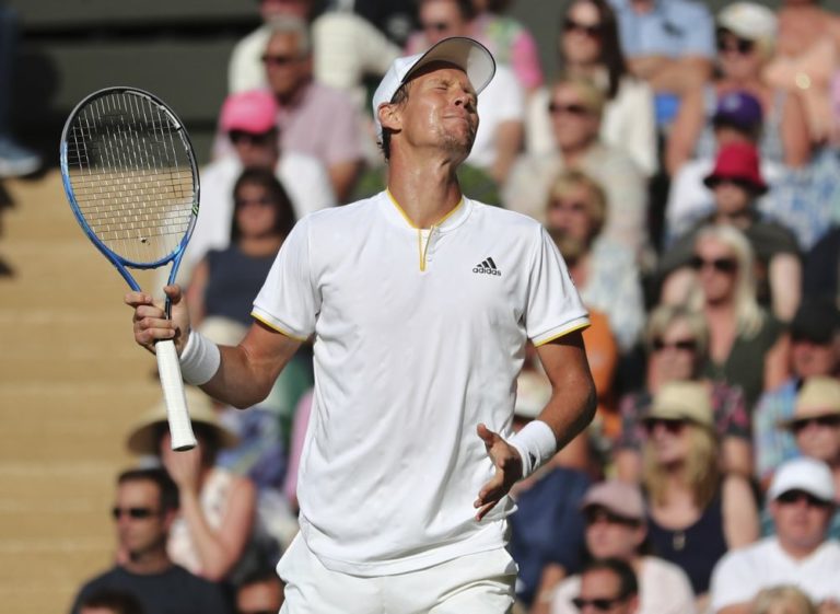 Čech Tomáš Berdych počas semifinále Wimbledonu, v ktorom podľahol Švajčiarovi Rogerovi Federerovi 6:7, 6:7, 4:6. Foto: SITA/AP