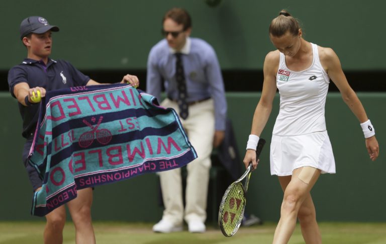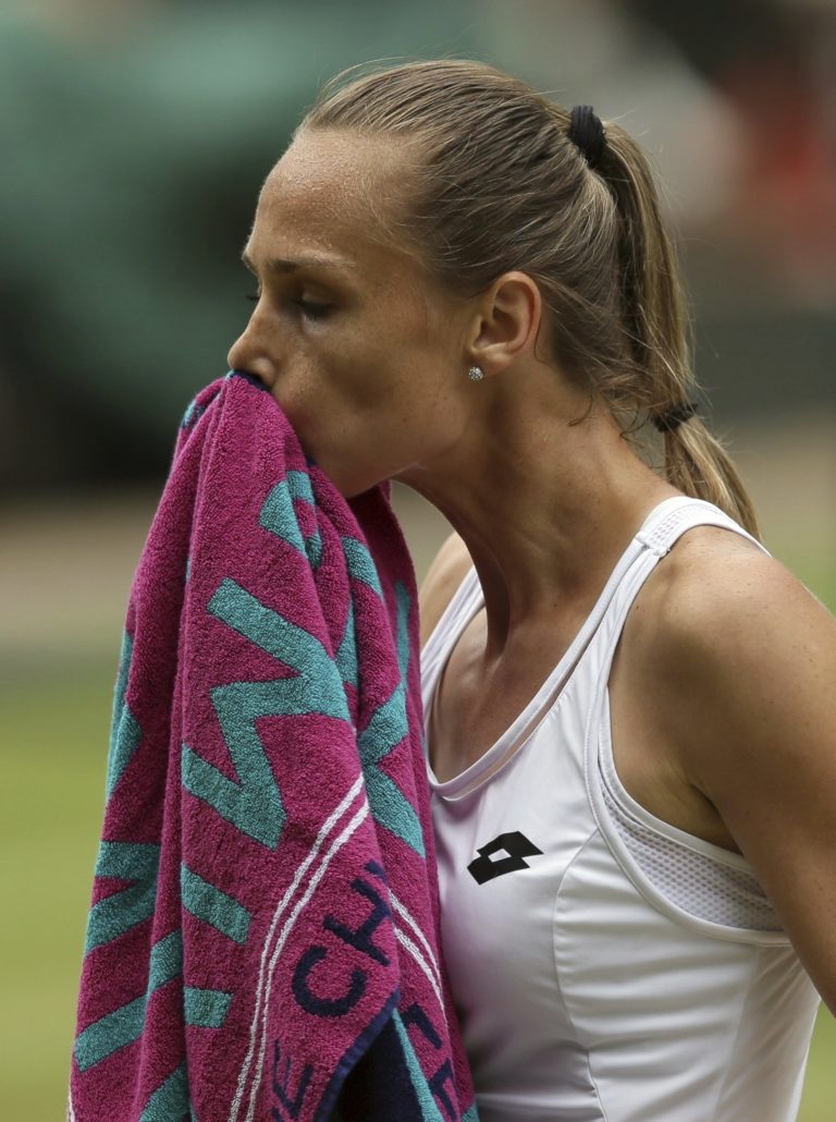 Slovakia's Magdalena Rybarikova wipes her face as she plays Spain's Garbine Muguruza during their Women's Singles semifinal match on day nine at the Wimbledon Tennis Championships in London Thursday, July 13, 2017. (AP Photo/Tim Ireland) Foto: SITA/AP.