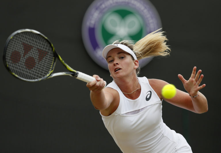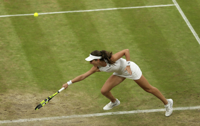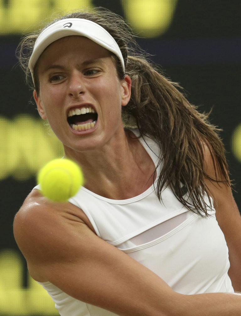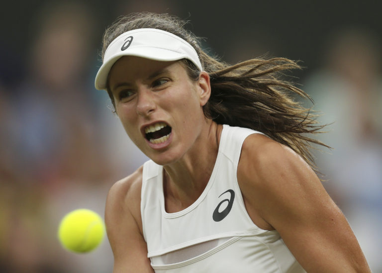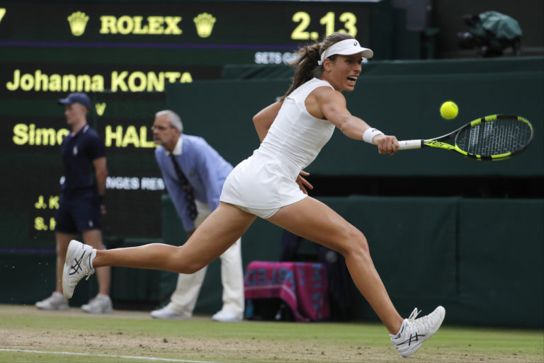 Britská tenistka Johanna Kontová počas štvrťfinálového zápasu na Wimbledone, v ktorom zdolala Rumunku Simonu Halepovú 7:6 (2), 6:7 (5), 4:6. Londýn, 11. júl 2017. Foto: SITA/AP.