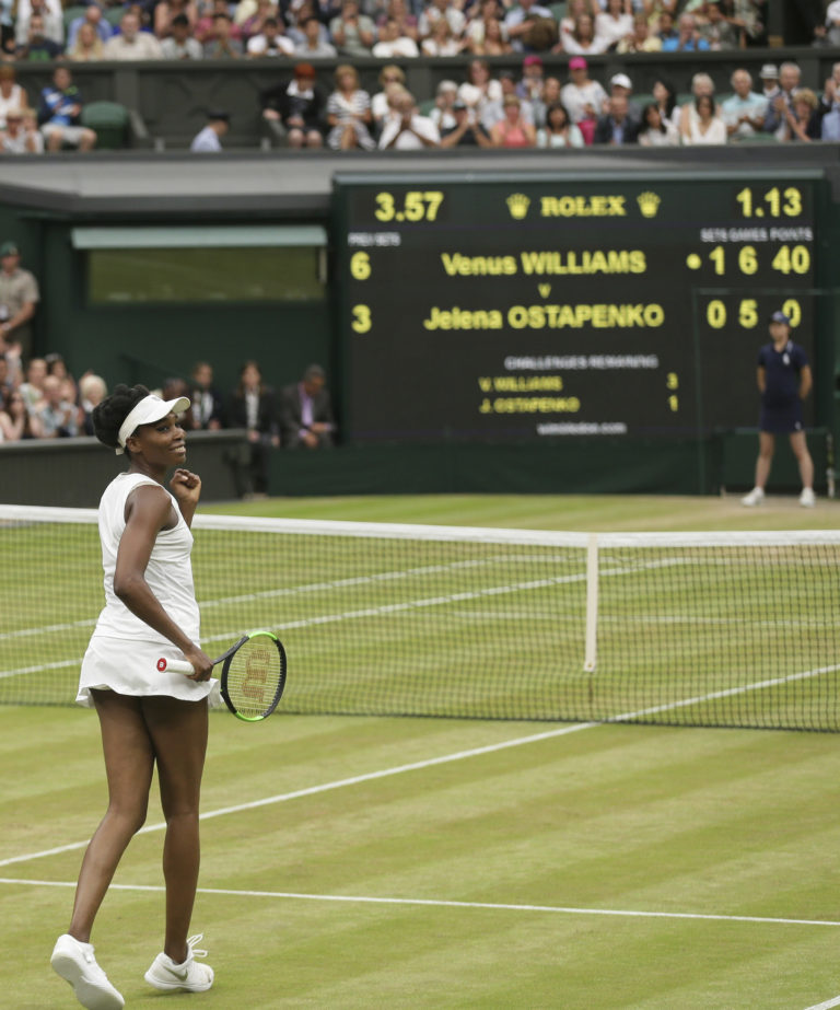 Americká tenistka Venus Williamsová počas štvrťfinálového zápasu na Wimbledone, v ktorom zdolala Lotyšku Jelenu Ostapenkovú 6:3, 7:5. Londýn, 11. júl 2017 Foto: SITA/AP.
