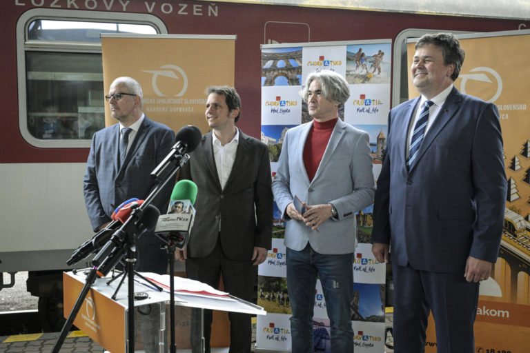 Zľava: Člen predstavenstva ZSSK Karol Henzély, podpredseda predstavenstva ZSSK Martin Bahurinský, riaditeľ zastúpenia Chorvátskeho turistického združenia v SR a ČR Miodrag Mlačić a generálny riaditeľ ZSSK Peter Helexa počas tlačovej konferencie Železničnej spoločnosti Slovensko (ZSSK) pri príležitosti prvej tohtoročnej jazdy sezónneho vlaku EuroNight z Bratislavy do chorvátskeho Splitu. Bratislava, 3. máj 2024. Foto: SITA/Milan Illík.