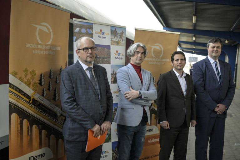Zľava: Člen predstavenstva ZSSK Karol Henzély, riaditeľ zastúpenia Chorvátskeho turistického združenia v SR a ČR Miodrag Mlačić, podpredseda predstavenstva ZSSK Martin Bahurinský a generálny riaditeľ ZSSK Peter Helexa počas tlačovej konferencie Železničnej spoločnosti Slovensko (ZSSK) pri príležitosti prvej tohtoročnej jazdy sezónneho vlaku EuroNight z Bratislavy do chorvátskeho Splitu. Bratislava, 3. máj 2024. Foto: SITA/Milan Illík.