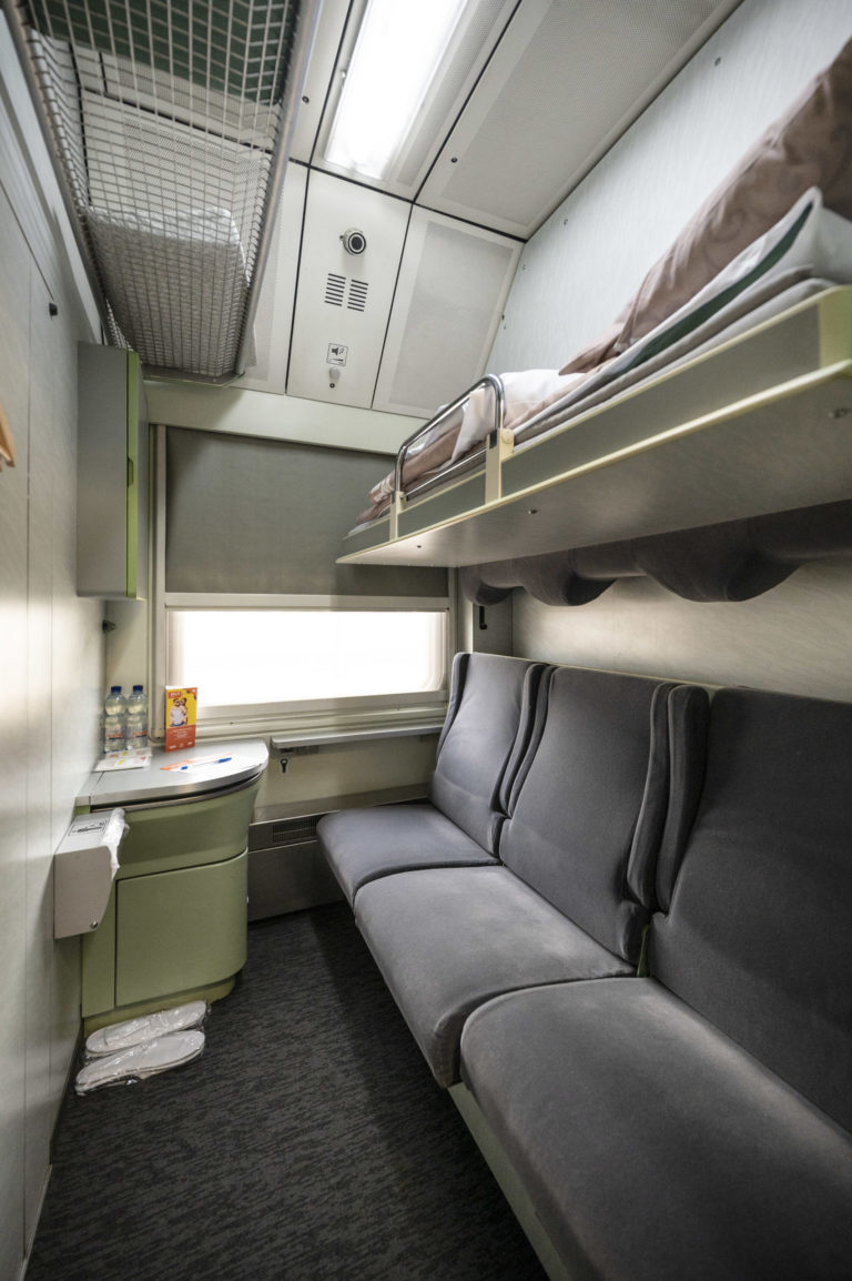 Interiér vlaku EuroNight počas tlačovej konferencie Železničnej spoločnosti Slovensko (ZSSK) pri príležitosti prvej tohtoročnej jazdy sezónneho vlaku EuroNight z Bratislavy do chorvátskeho Splitu. Bratislava, 3. máj 2024. Foto: SITA/Milan Illík.