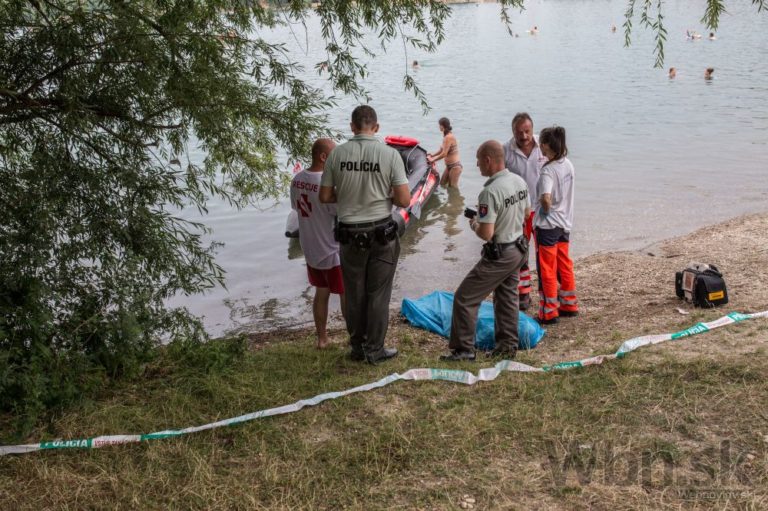 Policajné a záchranárske zložky vypočúvajú svedkov tragédie pri prírodnom jazere Veľký Draždiak, kde sa dnes popoludní utopila neznáma žena. Bratislava, 7. júl 2015. Foto: SITA/Marko Erd