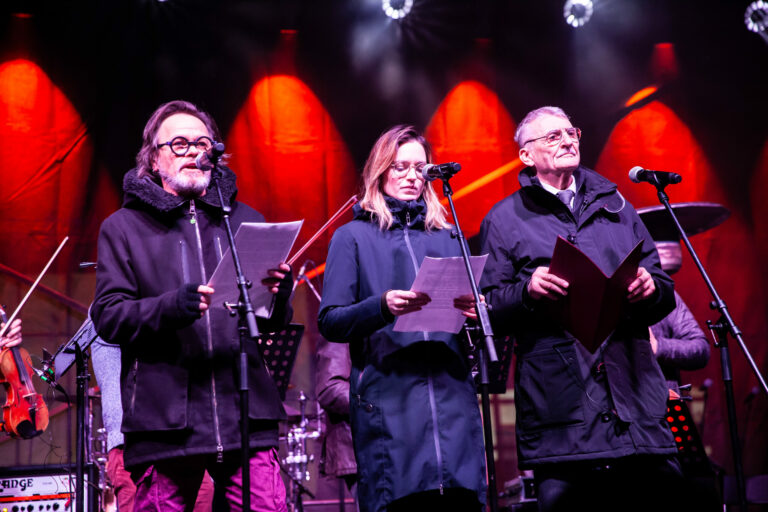Zľava: Herec Robert Roth, herečka Rebeka Poláková a herec Martin Huba počas príhovoru v rámci protestného zhromaždenia pod názvom Za budúcnosť kultúry oragnizovaného občianskou iniciatívou Otvorená kultúra! na Námestí slobody v Bratislave. Bratislava, 12. december 2024. Foto: SITA/Tomáš Bokor