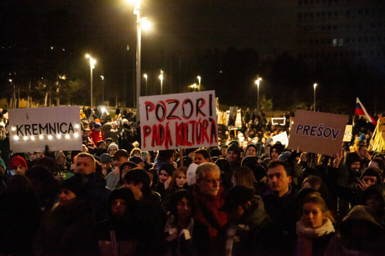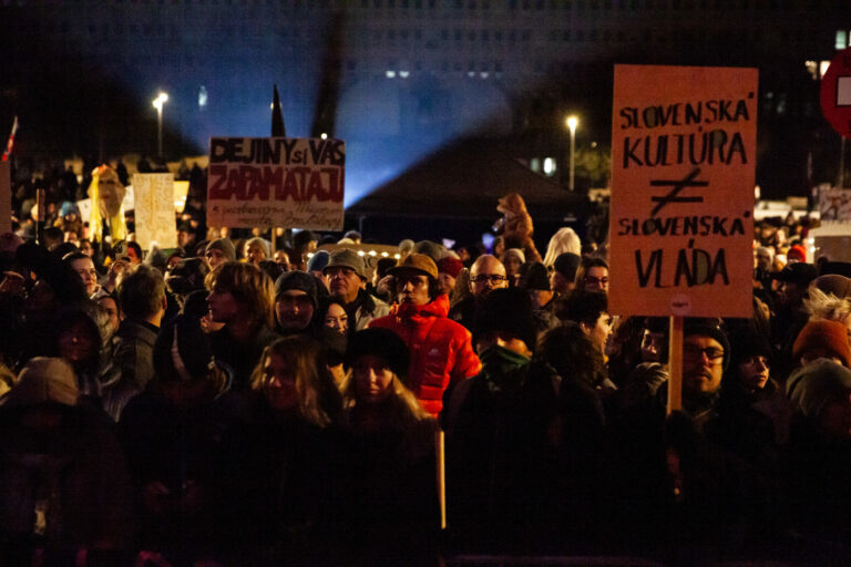Účastníci s transparentmi počas protestného zhromaždenia pod názvom Za budúcnosť kultúry oragnizovaného občianskou iniciatívou Otvorená kultúra! na Námestí Slovenského národného povstania v Bratislave. Bratislava, 12. december 2024. Foto: SITA/Tomáš Bokor