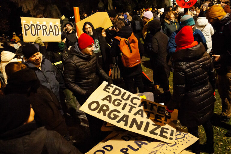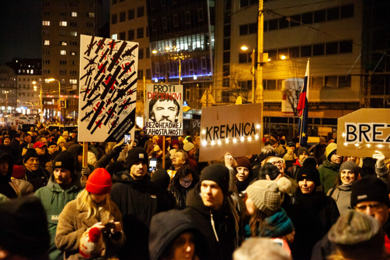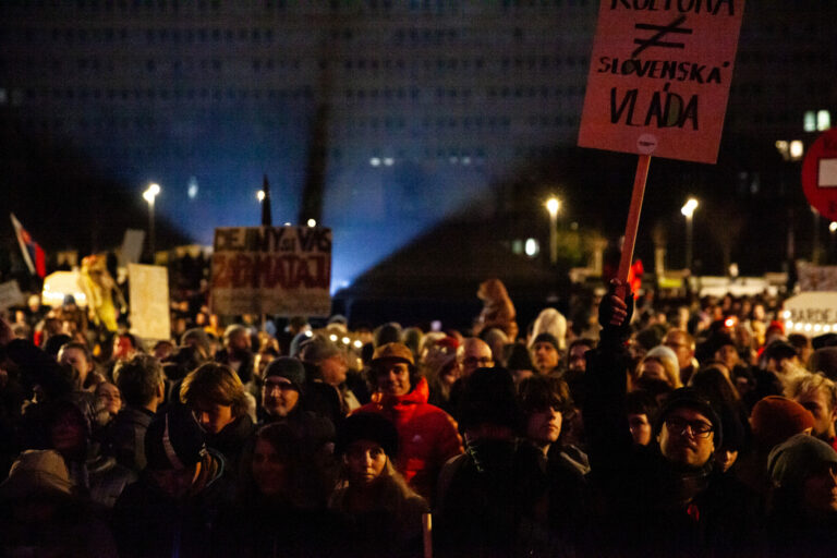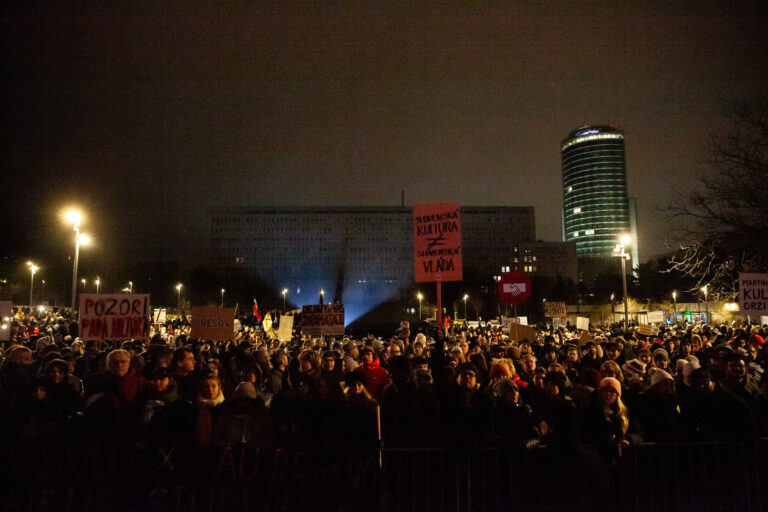 Atmosféra počas protestného zhromaždenia pod názvom Za budúcnosť kultúry oragnizovaného občianskou iniciatívou Otvorená kultúra! na Námestí Slovenského národného povstania v Bratislave. Bratislava, 12. december 2024. Foto: SITA/Tomáš Bokor