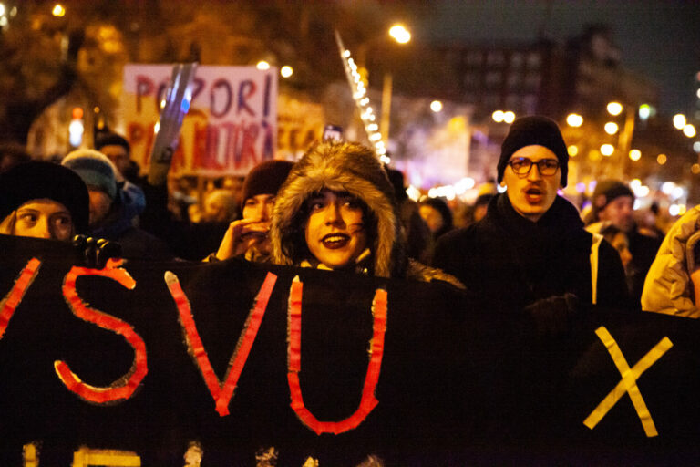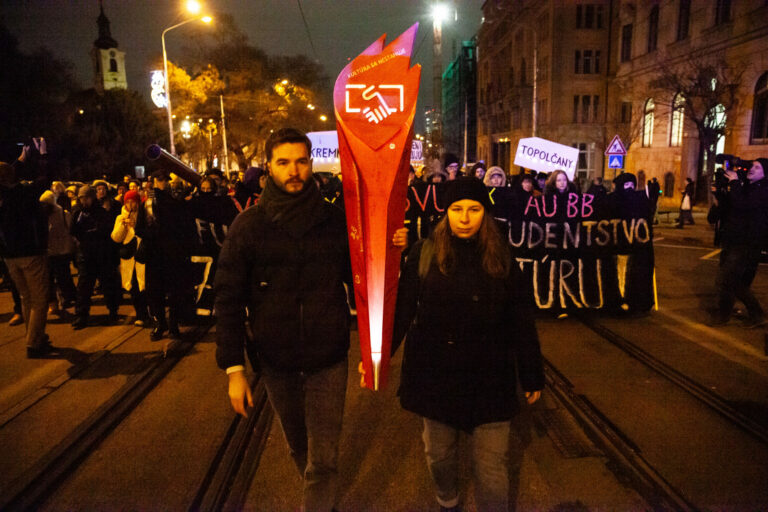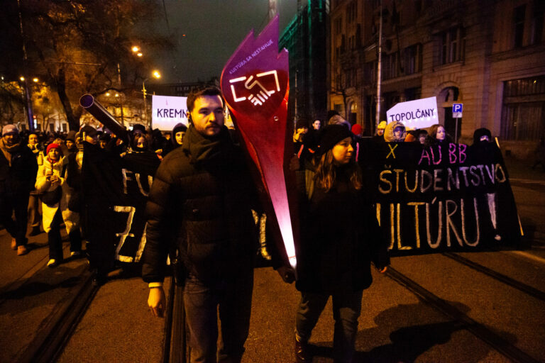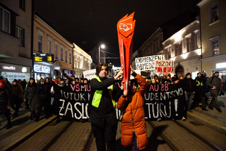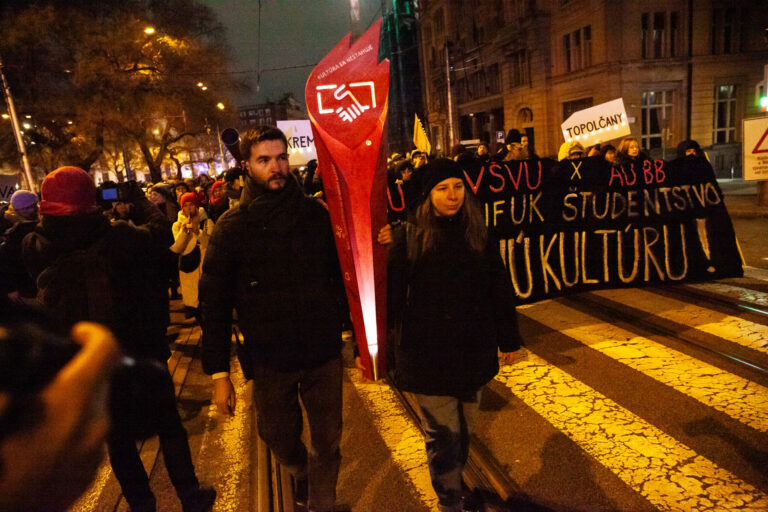 Účastníci s pochodňou a transparentmi počas protestného zhromaždenia pod názvom Za budúcnosť kultúry oragnizovaného občianskou iniciatívou Otvorená kultúra! na Námestí Slovenského národného povstania v Bratislave. Bratislava, 12. december 2024. Foto: SITA/Tomáš Bokor