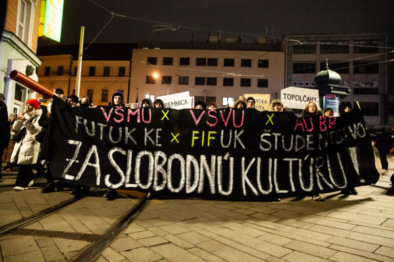 Účastníci s transparentom počas protestného zhromaždenia pod názvom Za budúcnosť kultúry oragnizovaného občianskou iniciatívou Otvorená kultúra! na Námestí Slovenského národného povstania v Bratislave. Bratislava, 12. december 2024. Foto: SITA/Tomáš Bokor