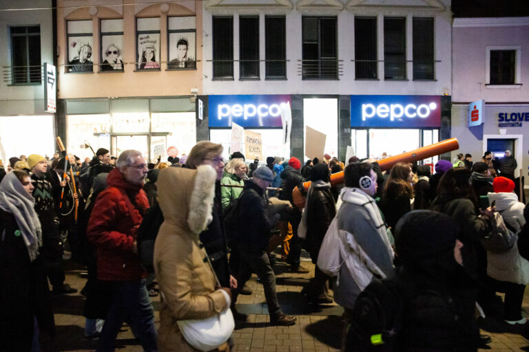 Atmosféra počas protestného zhromaždenia pod názvom Za budúcnosť kultúry oragnizovaného občianskou iniciatívou Otvorená kultúra! na Obchodnej ulici v Bratislave. Bratislava, 12. december 2024. Foto: SITA/Tomáš Bokor