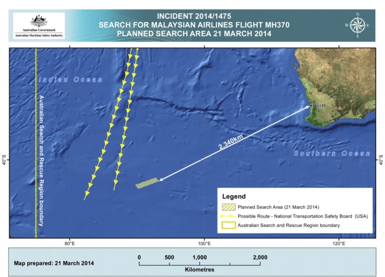 Mapa poskytnutá austrálskymi úradmi ukazuje oblasť, v ktorej družice zachytili možné trosky lietadla spoločnosti Malaysia Airlines, ktoré zmizlo bez stopy v sobotu 8. marca. Za jeho nájdenie sa modlí celý svet. Foto: SITA/AP