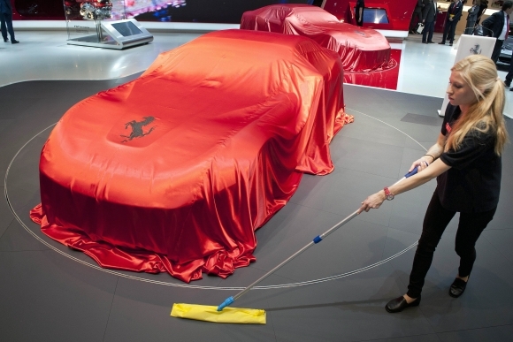 Žena upratuje pred odhalením modelu od Ferrari. Foto: SITA/AP