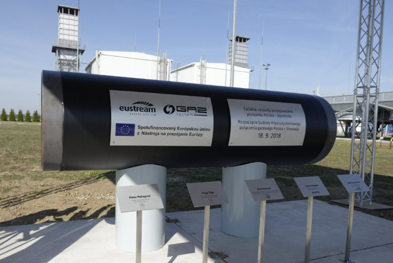 Symbolická rúra budúceho plynovodu počas slávnostného začatia výstavby Prepojovacieho plynovodu Poľsko - Slovensko v priestoroch kompresorovej stanice vo Veľkých Kapušanoch. Veľké Kapušany, 18. september 2018. Foto: SITA/Ivan Fleischer