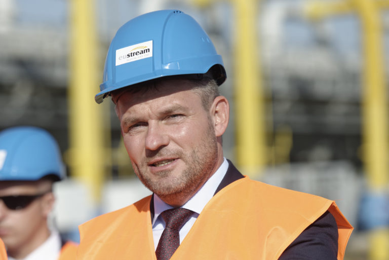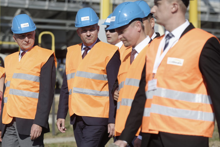 Predseda vlády Peter Pellegrini (v popredí) počas slávnostného začatia výstavby Prepojovacieho plynovodu Poľsko - Slovensko v priestoroch kompresorovej stanice vo Veľkých Kapušanoch. Veľké Kapušany, 18. september 2018. Foto: SITA/Ivan Fleischer
