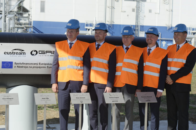 Zľava: Minister hospodárstva Peter Žiga, predseda vlády Peter Pellegrini, splnomocnenec vlády Poľskej republiky pre strategickú energetickú infraštruktúru Piotr Naimski, predseda predstavenstva Gaz System Tomasz Stępień a generálny riaditeľ Eustreem Rastislav Ňukovič počas slávnostného začatia výstavby Prepojovacieho plynovodu Poľsko - Slovensko v priestoroch kompresorovej stanice vo Veľkých Kapušanoch. Veľké Kapušany, 18. september 2018. Foto: SITA/Ivan Fleischer