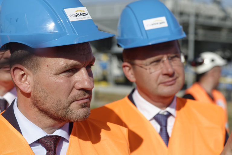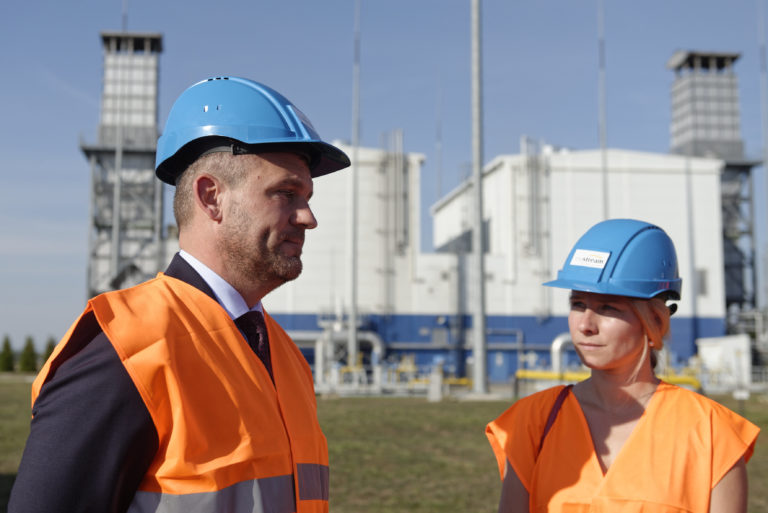 Predseda vlády Peter Pellegrini (vľavo) počas slávnostného začatia výstavby Prepojovacieho plynovodu Poľsko - Slovensko v priestoroch kompresorovej stanice vo Veľkých Kapušanoch. Veľké Kapušany, 18. september 2018. Foto: SITA/Ivan Fleischer