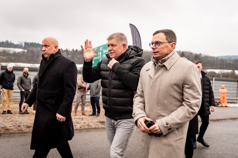 Generálny riaditeľ Národnej diaľničnej spoločnosti Filip Macháček (tretí sprava), predseda vlády Robert Fico (druhý sprava), minister dopravy Jozef Ráž (štvrtý sprava) a minister zahraničných vecí a európskych záležitostí SR Juraj Blanár počas slávnostného poklepania základného kameňa na mieste výstavby úseku D3 Žilina, Brodno - Kysucké Nové Mesto. Žilina, 26. január 2026. Foto: SITA/Úrad vlády SR