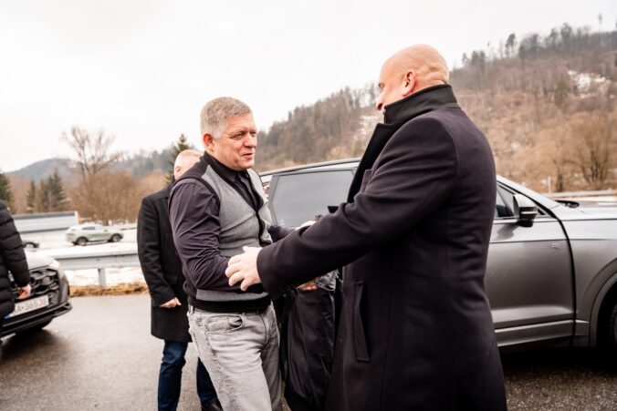 V popredí zľava: Predseda vlády Robert Fico a minister dopravy Jozef Ráž počas slávnostného poklepania základného kameňa na mieste výstavby úseku D3 Žilina, Brodno - Kysucké Nové Mesto. Žilina, 26. január 2026. Foto: SITA/Úrad vlády SR