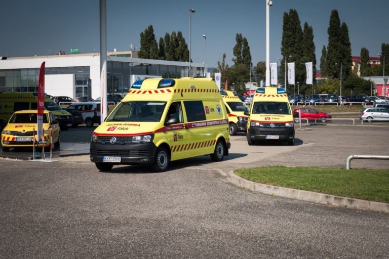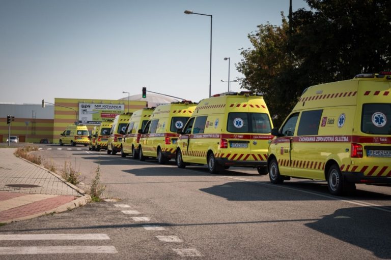 Nové sanitky pred spanilou jazdou sanitiek spoločnosti Falck Záchranná, ktorou si uctili pamiatku obetí tragickej nehody záchranárskeho vrtuľníka v lokalite Strelníky. Bratislava, 8. september 2016. Foto: SITA/Marek Mrviš