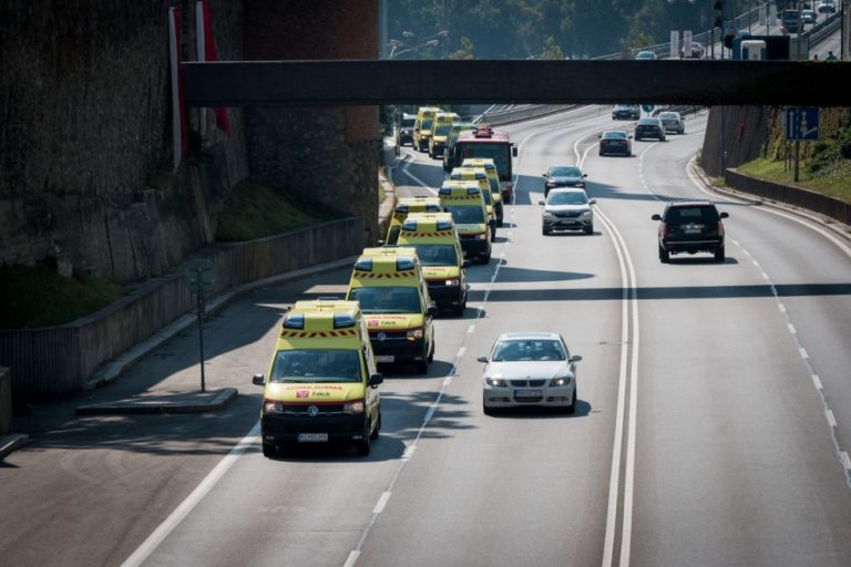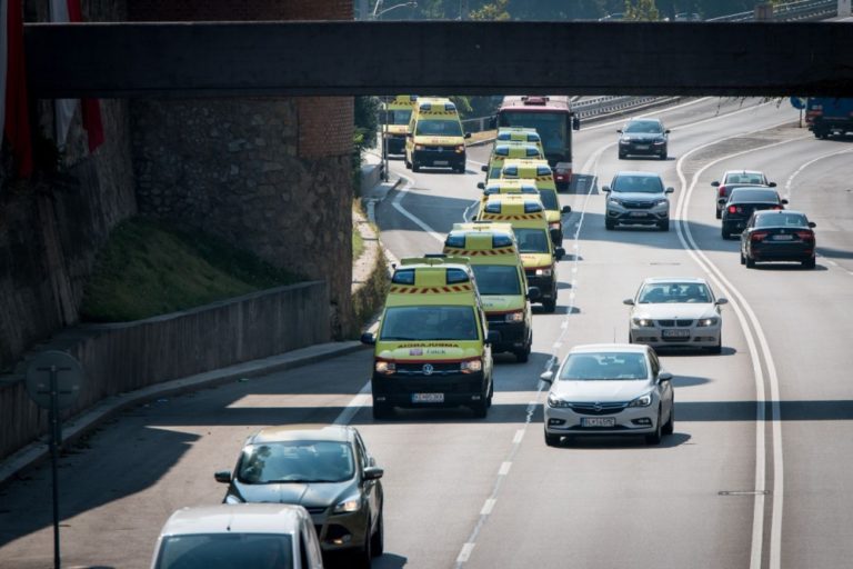 Pohľad na spanilú jazdu sanitiek spoločnosti Falck Záchranná, ktorou si uctili pamiatku obetí tragickej nehody záchranárskeho vrtuľníka v lokalite Strelníky. Bratislava, 8. september 2016. Foto: SITA/Marek Mrviš