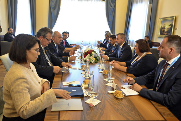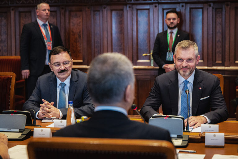 Uprostred zľava: Slovenský prezident Peter Pellegrini a maďarský prezident Tamás Sulyok počas stretnutia v rámci oficiálnej návštevy prezidenta SR v Budapešti. Budapešť, 18. júl 2024. Foto: SITA/Milan Illík