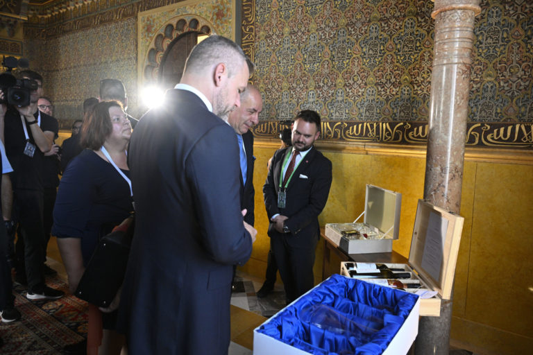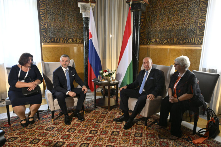 Prezident Slovenska Peter Pellegrini (vpravo) a predseda Národného zhromaždenia Maďarska László Kövér (uprostred) počas rokovania v budove maďarského parlamentu v rámci oficiálnej návštevy prezidenta SR v Budapešti. Budapešť, Maďarsko, 18. júl 2024. Foto: SITA/Kancelária prezidenta SR