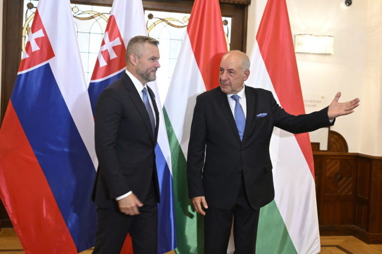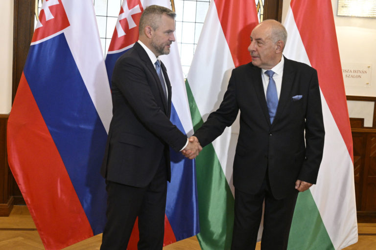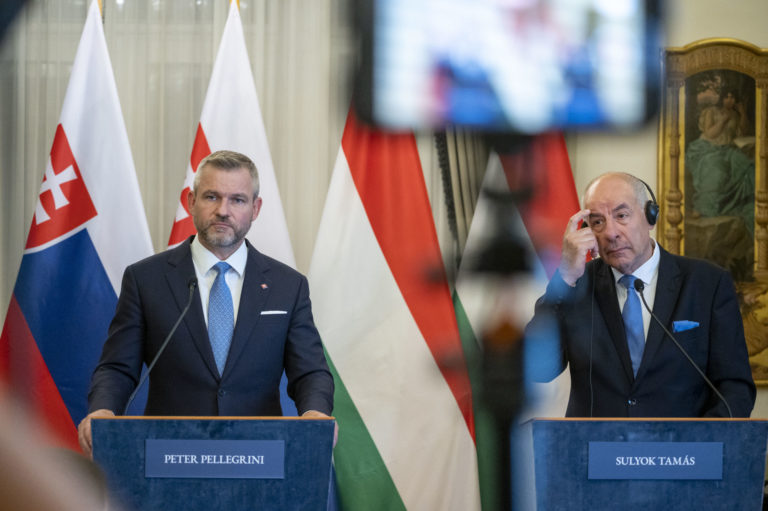 Zľava: Slovenský prezident Peter Pellegrini  a maďarský prezident Tamás Sulyok počas stretnutia v rámci oficiálnej návštevy prezidenta SR v Budapešti. Budapešť, 18. júl 2024. Foto: SITA/Milan Illík