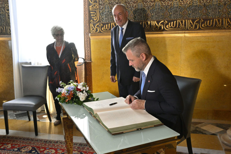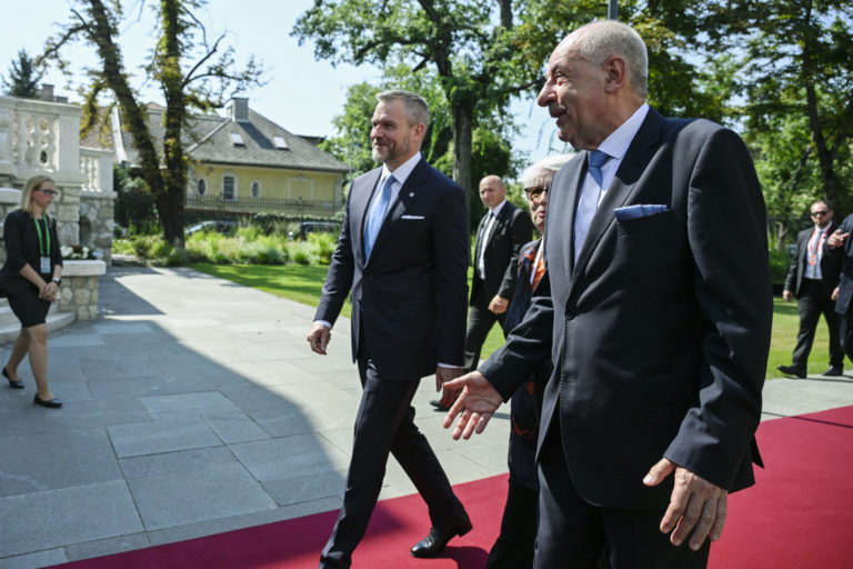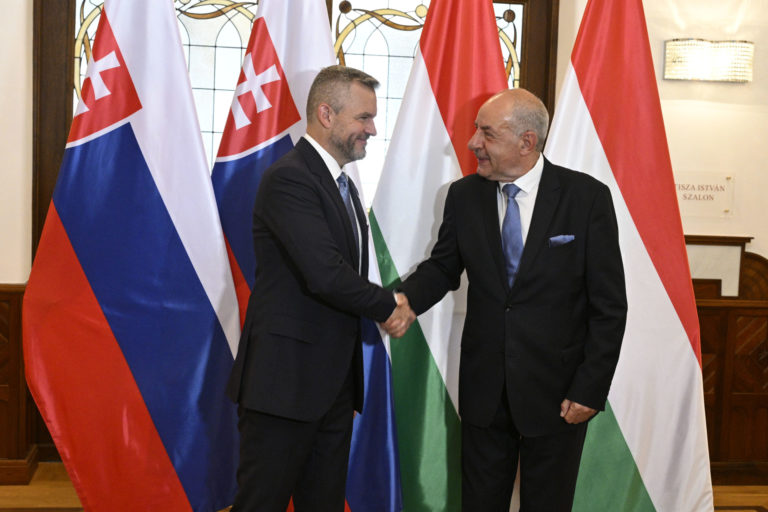 Zľava: Slovenský prezident Peter Pellegrini a maďarský prezident Tamás Sulyok počas stretnutia v rámci oficiálnej návštevy prezidenta SR v Budapešti. Budapešť, 18. júl 2024. Foto: SITA/Milan Illík
