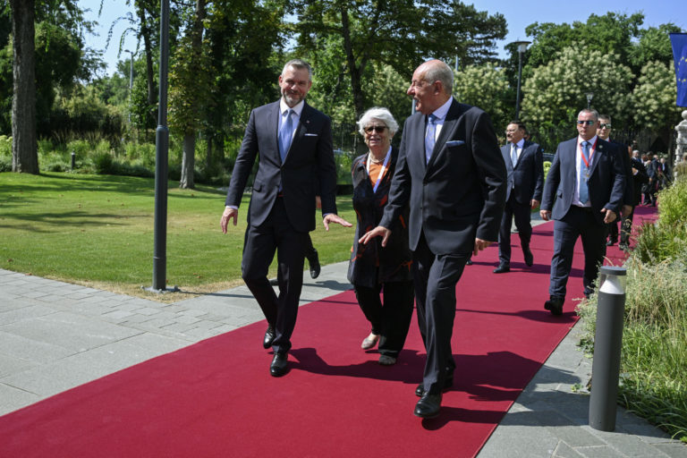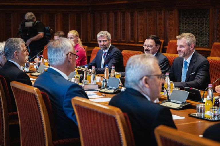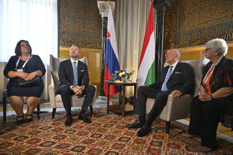 Slovenský prezident Peter Pellegrini (tretí sprava) a maďarský prezident Tamás Sulyok (druhý sprava) počas stretnutia v rámci oficiálnej návštevy prezidenta SR v Budapešti. Budapešť, 18. júl 2024. Foto: SITA/Milan Illík