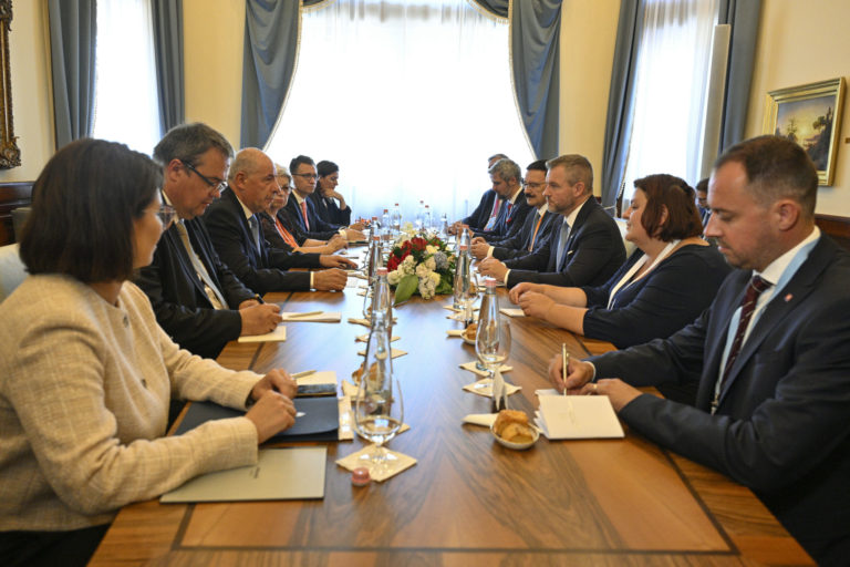 Slovenský prezident Peter Pellegrini (tretí sprava) a maďarský prezident Tamás Sulyok (tretí zľava) počas rokovania v rámci oficiálnej návštevy prezidenta SR v Budapešti. Budapešť, 18. júl 2024. Foto: SITA/Milan Illík